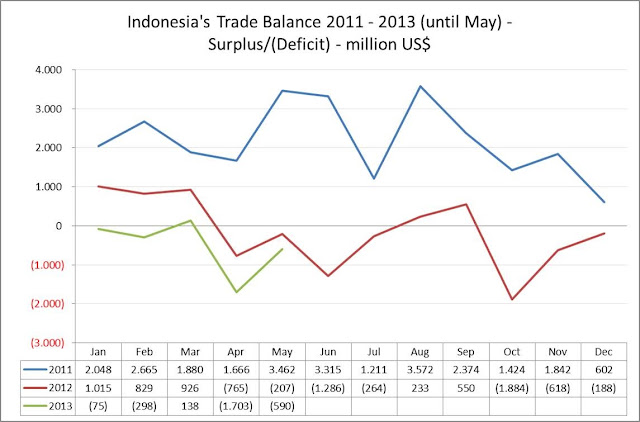 Ekonomi Indonesia masih terus mengalami tekanan. Neraca perdagangan pada bulan Mei 2013 membukukan defisit sebesar 590 juta dolar AS, sehingga total defisit selama 5 bulan pertama tahun 2013 menjadi 2,53 miliar dolar AS. Defisit ini meningkat dari sebulan sebelumnya (Januari – April 2013) yang sebesar Rp 1,94 miliar dolar AS. Dibandingkan dengan periode yang sama tahun 2012, neraca perdagangan kita jauh terpuruk. Untuk periode Januari – Mei 2012, neraca perdagangan Indonesia mengalami surplus 1,80 miliar dolar AS. Bahkan selama 5 bulan pertama tahun 2011 surplus neraca perdagangan Indonesia mencapai 11,72 miliar dolar AS.