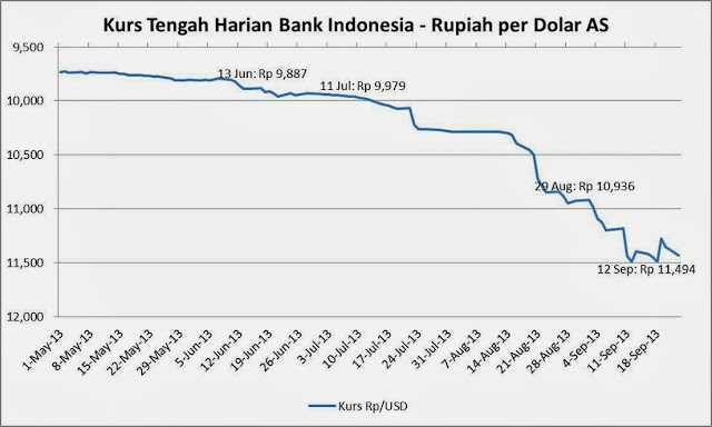 Kurs rupiah pada tanggal 13 Juni 2013 tercatat sebesar Rp 9.887 per dolar AS, dan tidak berubah secara berarti meskipun cenderung melemah setelah BI rate naik menjadi 6%. Lihat grafik di bawah ini.